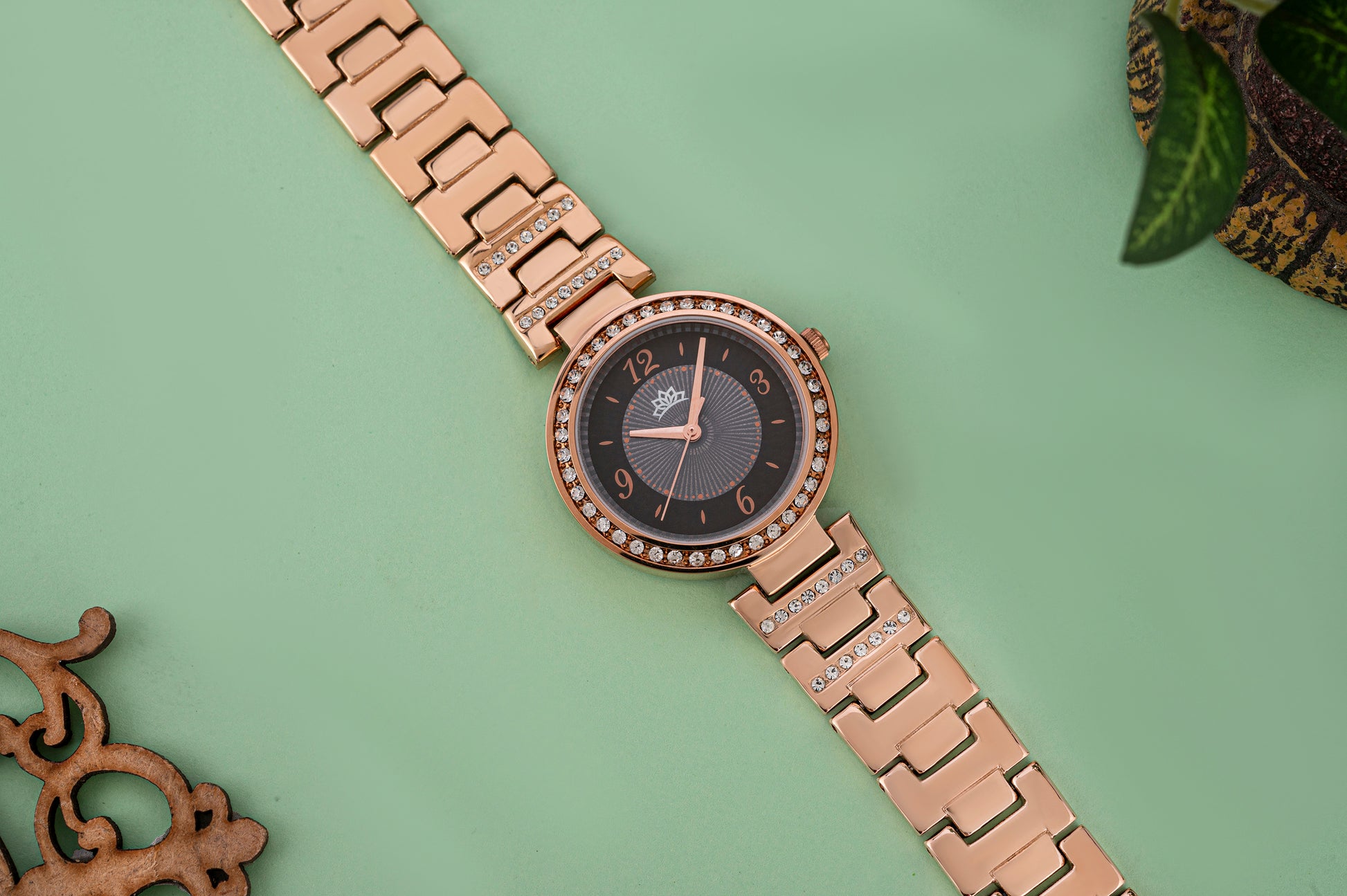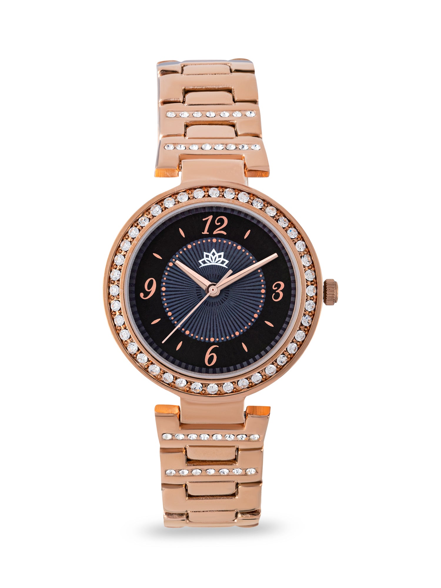 The Dhyara women’s watch is designed to exude elegance and sophistication. Featuring a refined black dial with rose gold accents, it is framed in a sparkling crystal-studded bezel and matched with a rose gold-tone strap embellished with crystal detailing. This stylish timepiece makes the perfect accessory for parties, formal occasions, or daily wear with a touch of luxury.