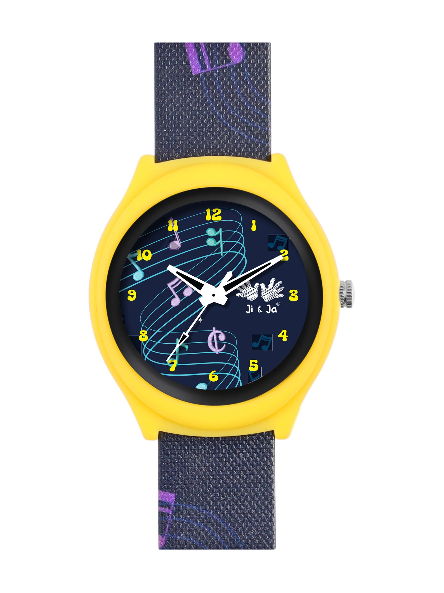 The Ji and Ja kids’ analog watch strikes the right note with its fun musical theme. Featuring a black dial decorated with colorful music notes and a stylish strap with matching patterns, this timepiece is perfect for young music lovers. Lightweight, durable, and easy to wear, it adds a playful rhythm to everyday school or playtime outfits.