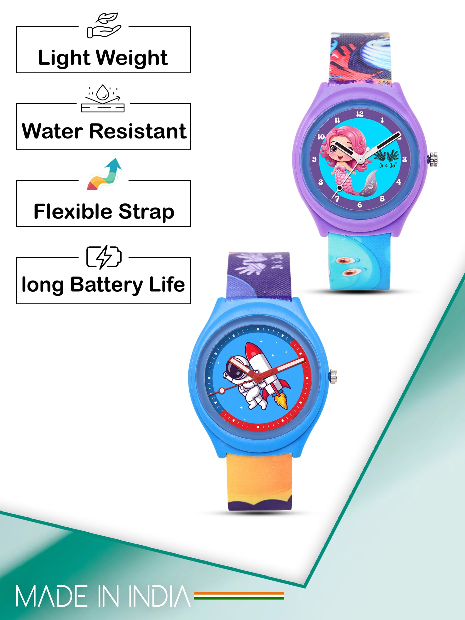 This Ji & Ja kids’ combo pack is perfect for little space explorers and ocean dreamers. One watch features a fun astronaut with a rocket theme, while the other shows a cute mermaid design, both crafted to spark imagination. Made with lightweight cases and soft silicone straps, these watches are comfortable, durable, and easy to wear. A playful way to make learning time exciting, these watches are a perfect gift for kids.