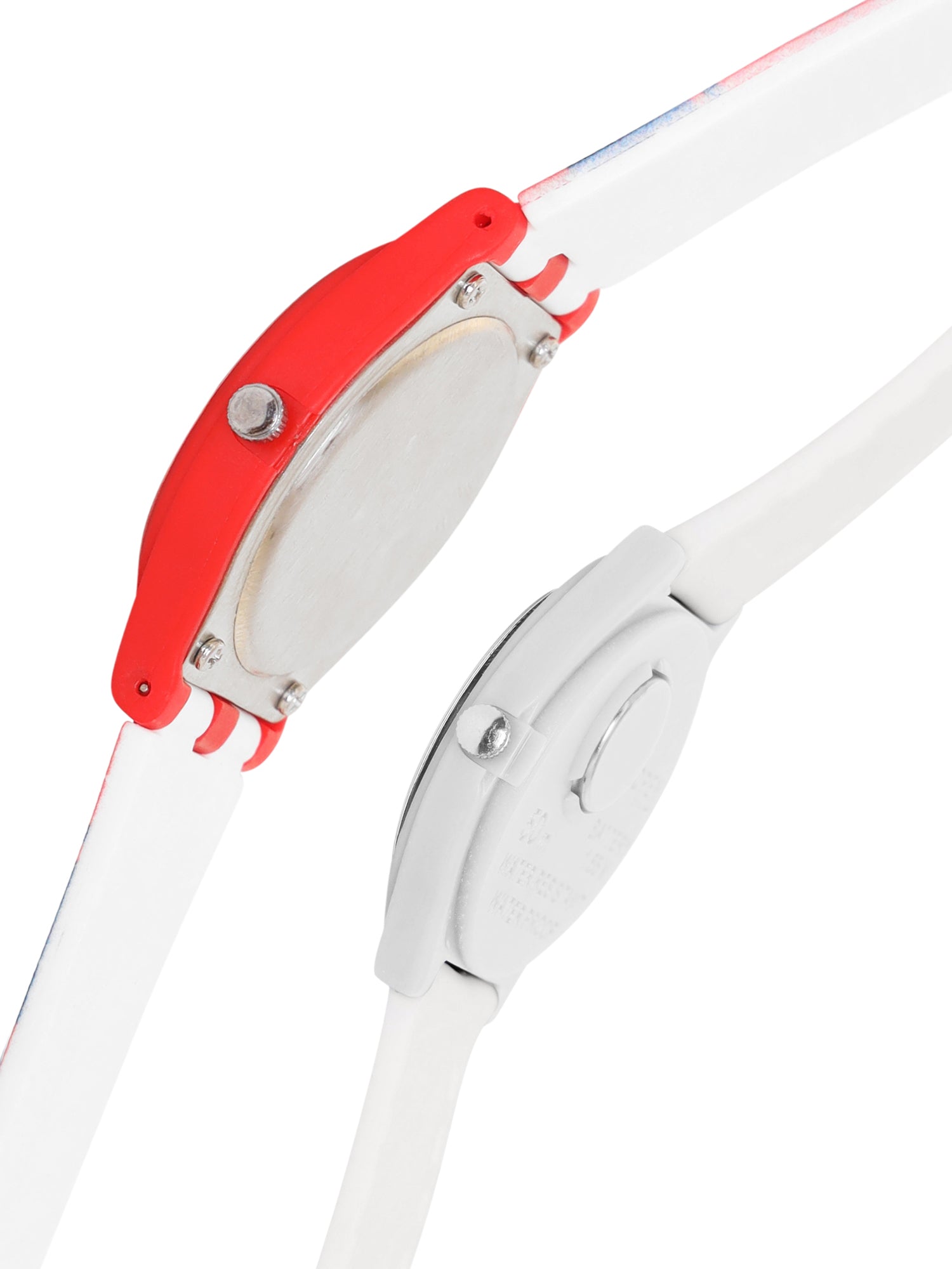 Strap Material (Watch 2): White Silicone Strap with Red & Black Stripes