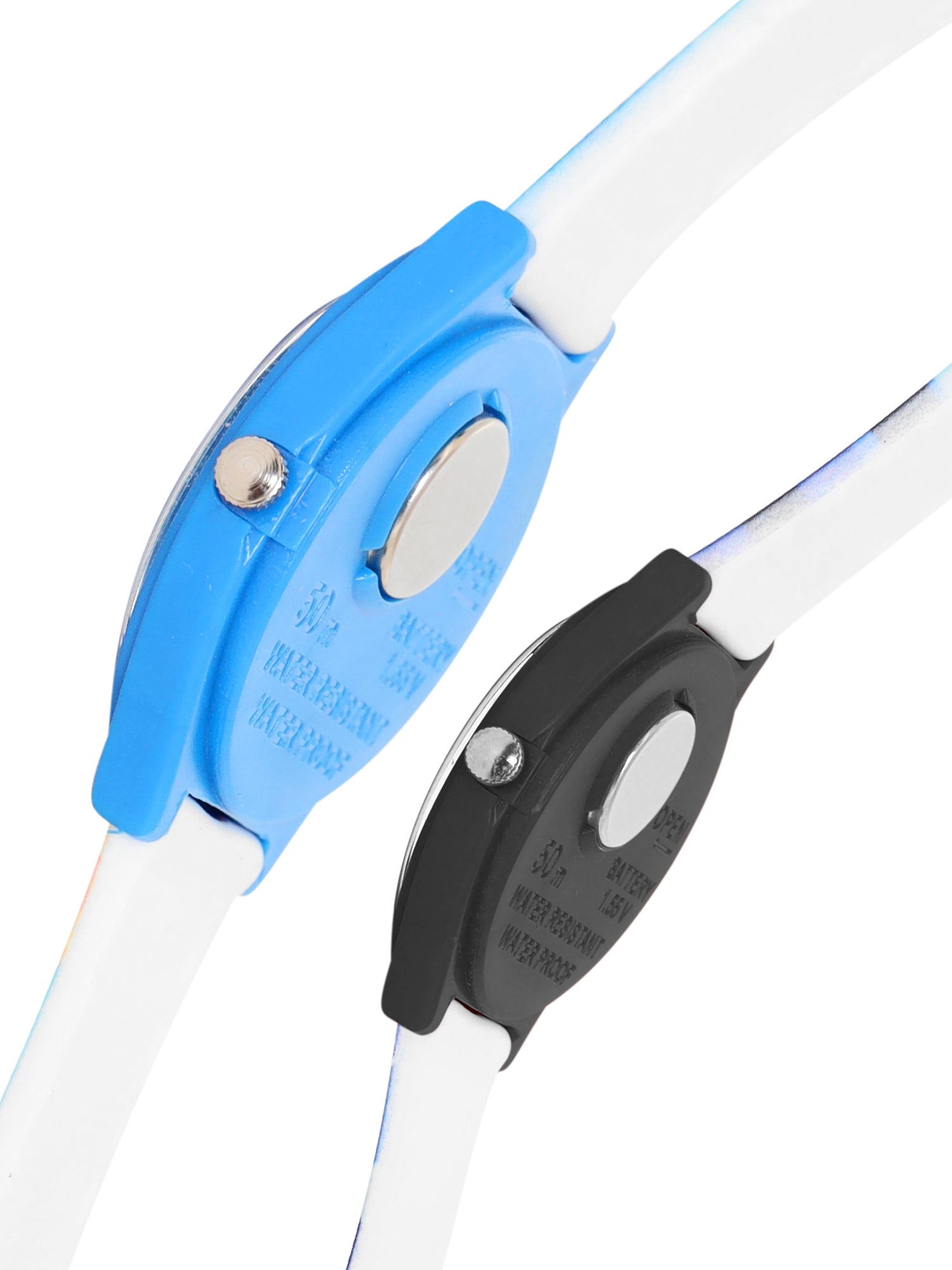 This Ji and Ja kids’ combo pack brings fun and style to everyday wear. The first watch features a sleek white dial with bold orange and blue markers paired with a cool camouflage strap, while the second watch adds playful vibes with a colorful shark cartoon dial and an ocean-inspired strap. Designed for comfort, durability, and a splash of creativity, these watches are perfect for kids who love both adventure and style.