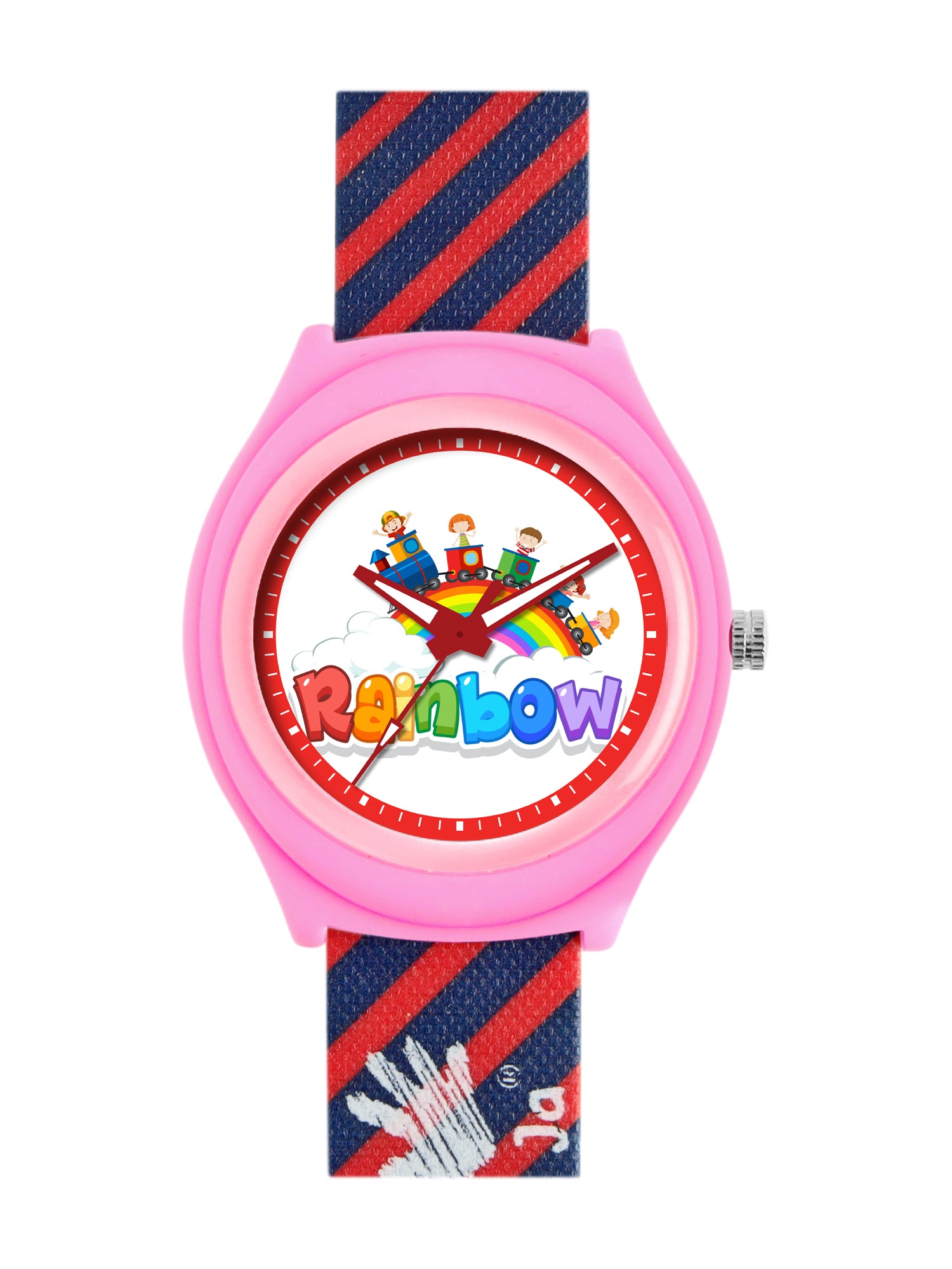 Brighten up your child’s day with the Ji and Ja Rainbow kids’ analog watch. Featuring a fun rainbow graphic on the dial and a vibrant pink case, this watch is designed for cheerful personalities. The striped silicone strap adds a trendy touch while ensuring comfort and durability. Perfect for school, playdates, or gifting, this watch makes learning to tell time more exciting for kids.
