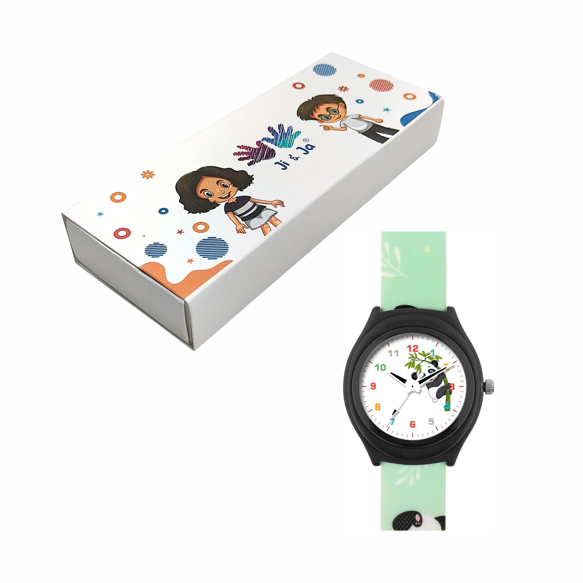 The Ji and Ja kids’ analog watch combines cuteness and comfort with its panda-themed design. Featuring a clean white dial, colorful markers, and a charming panda print strap, it’s perfect for children who love animals. Lightweight yet durable, this watch makes a fun and practical accessory for school, playtime, or everyday wear.