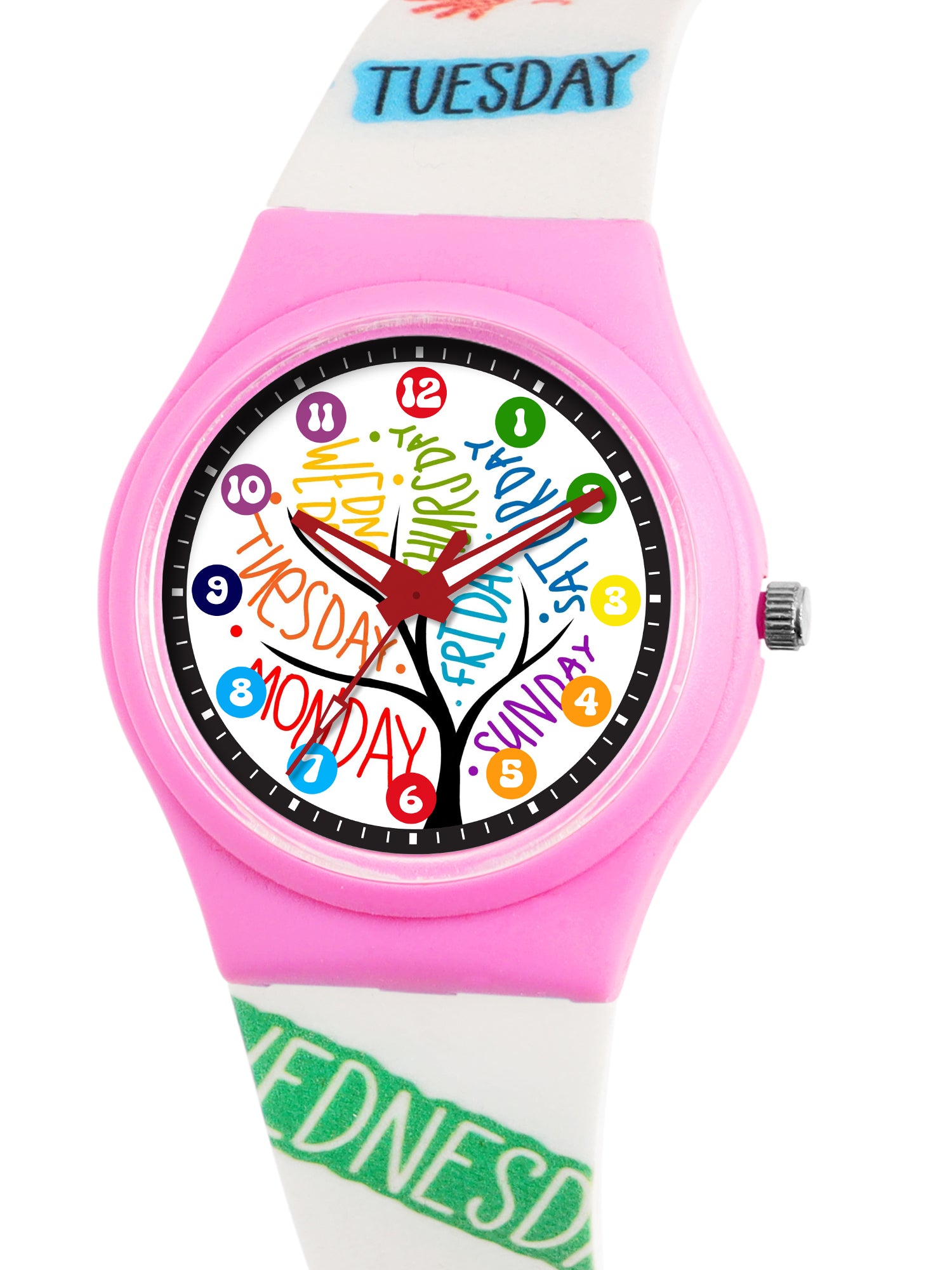 The Ji and Ja kids’ analog watch makes learning fun with a playful days-of-the-week theme on its dial and strap. The bright pink case adds a cheerful touch, while the soft silicone strap ensures comfort for everyday wear. Designed to be lightweight and durable, this watch is perfect for helping children keep track of time in a colorful and engaging way.