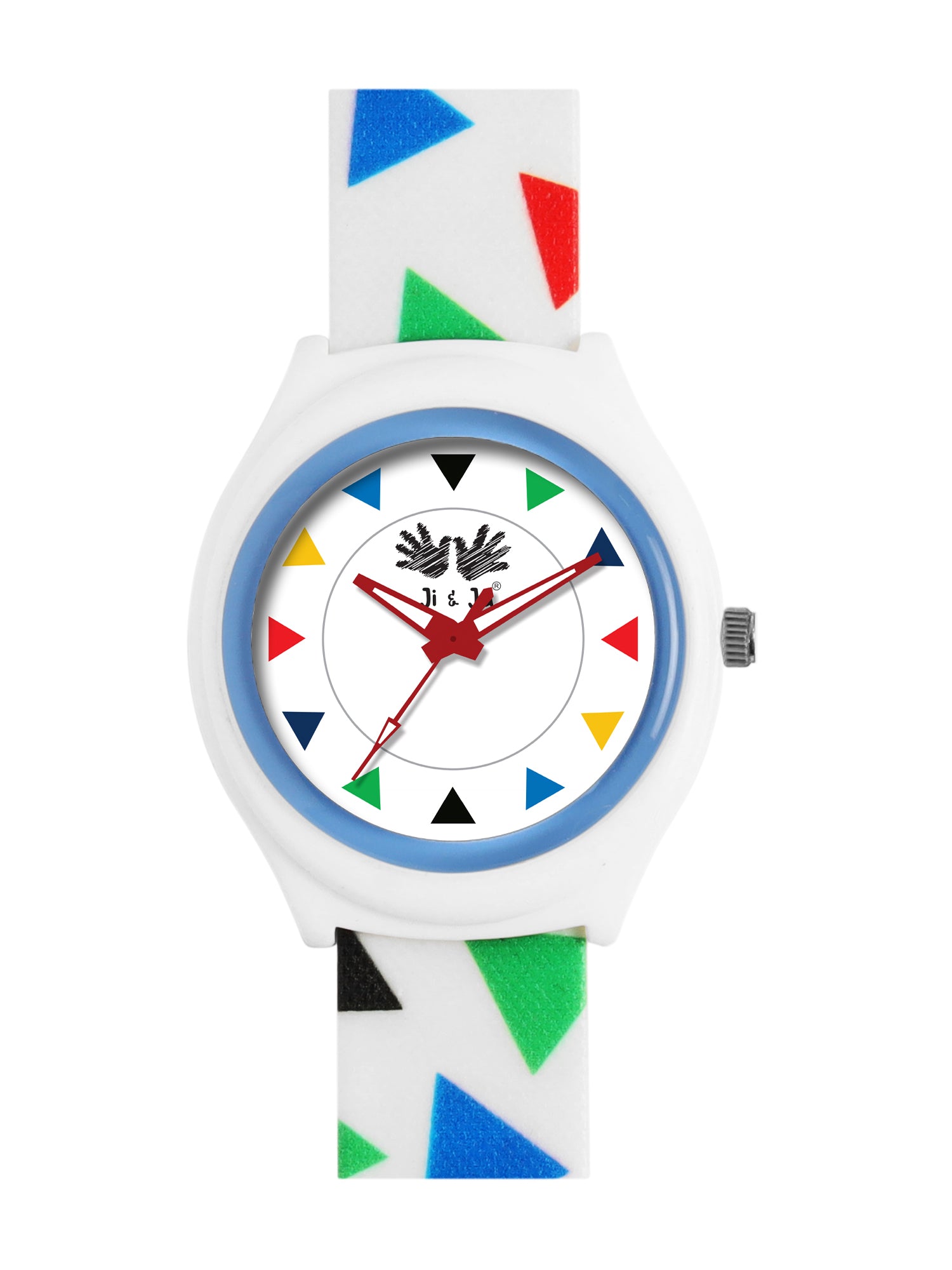The Ji and Ja kids’ analog watch adds a burst of creativity and fun to timekeeping. Featuring a bright white dial with colorful geometric markers and a playful printed silicone strap, it’s perfect for kids who love vibrant designs. Lightweight and durable, this watch is ideal for everyday school or playtime wear.