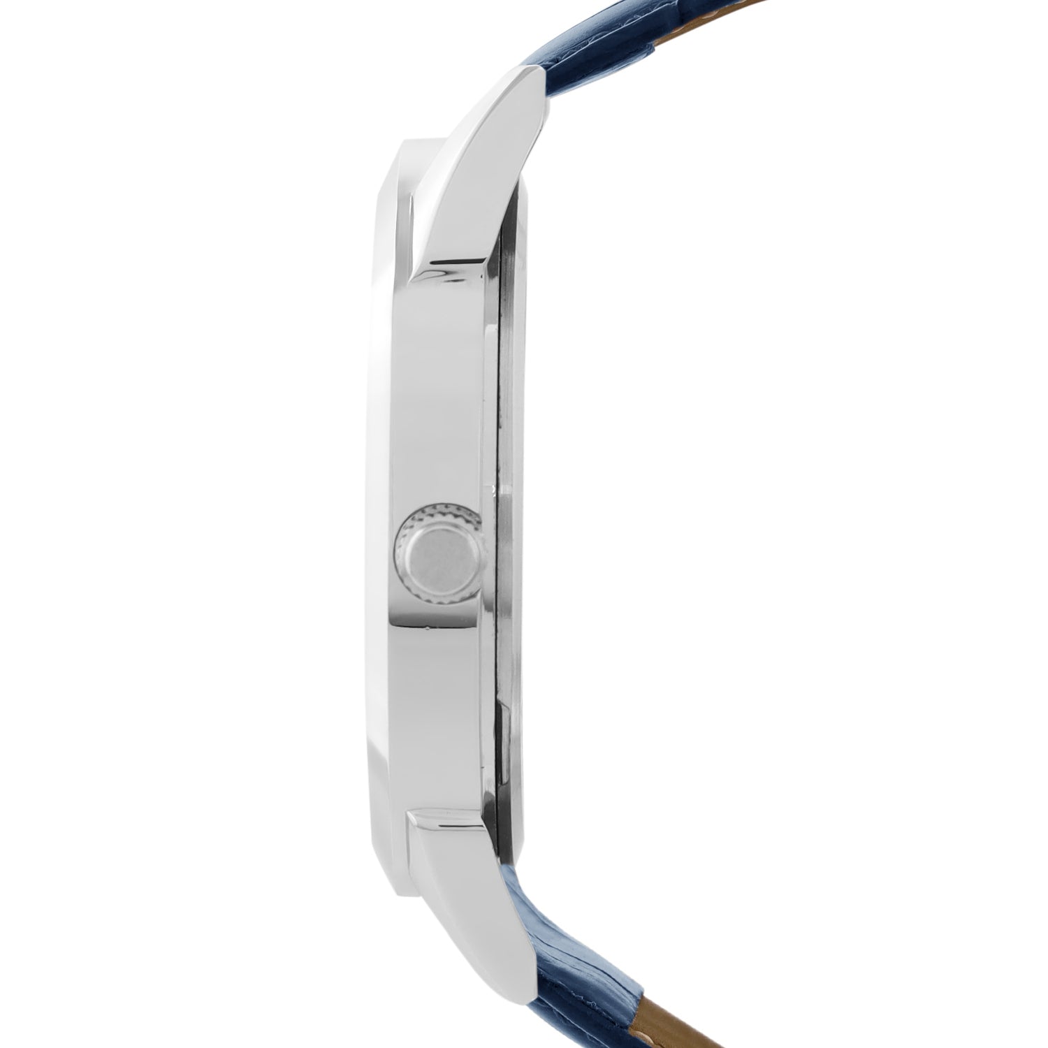 Strap Material: Blue Leather Textured Strap with White Stitching