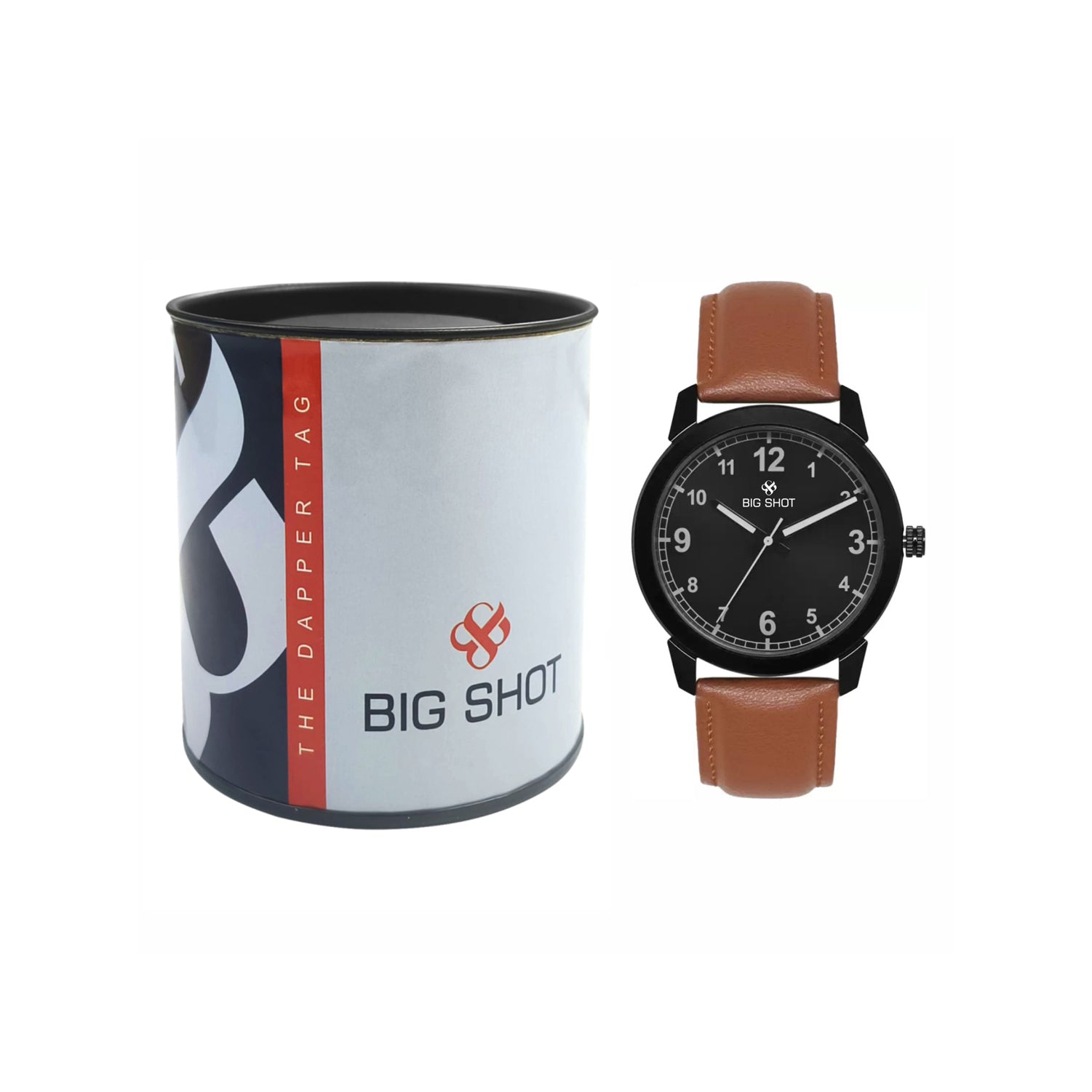 The Big Shot men’s analog watch blends rugged durability with classic style. Featuring a bold black dial with clear white numerals, it ensures easy readability while maintaining a modern masculine appeal. The sturdy black case is paired with a rich brown leather strap, offering both comfort and timeless elegance. Perfect for everyday wear, office looks, and casual outings.