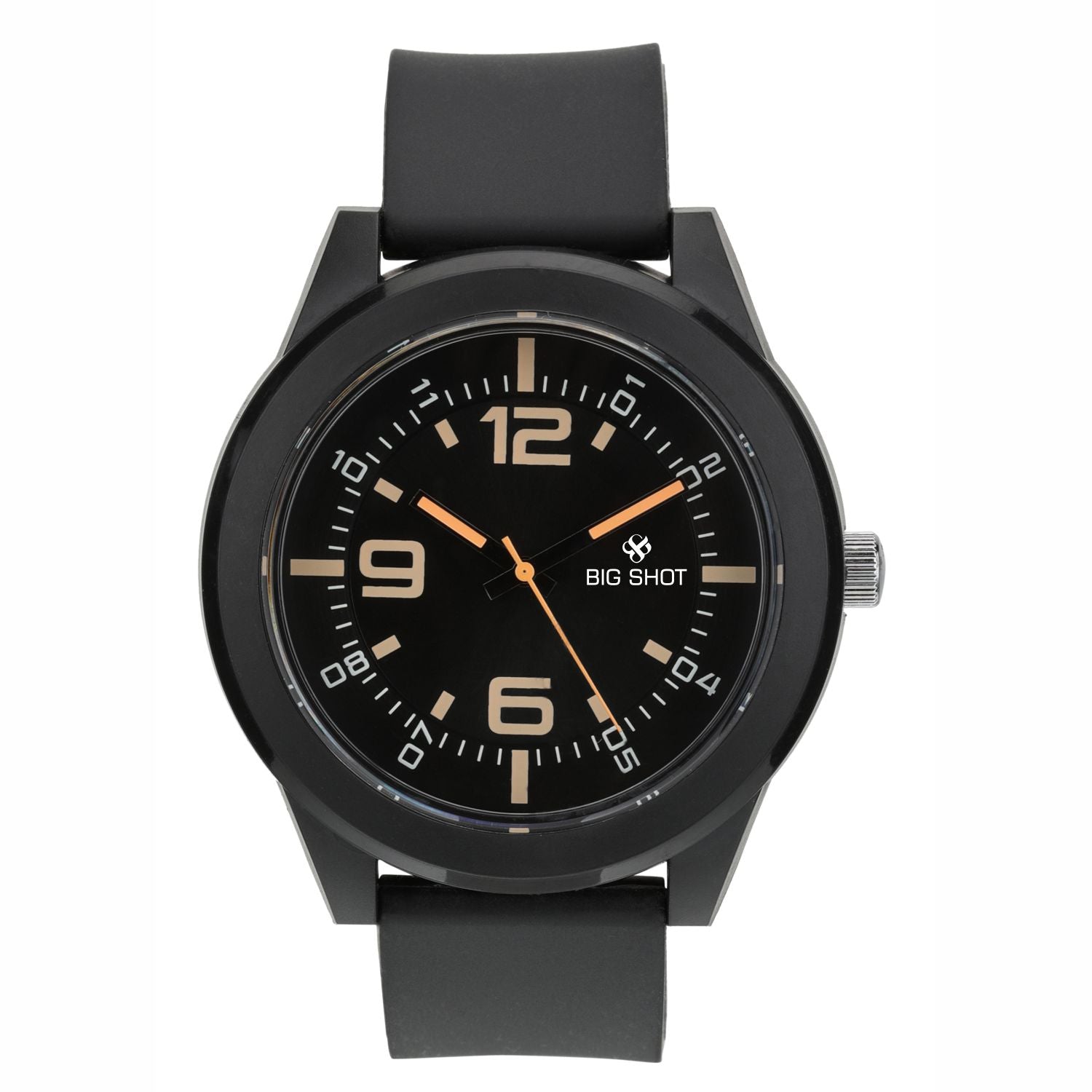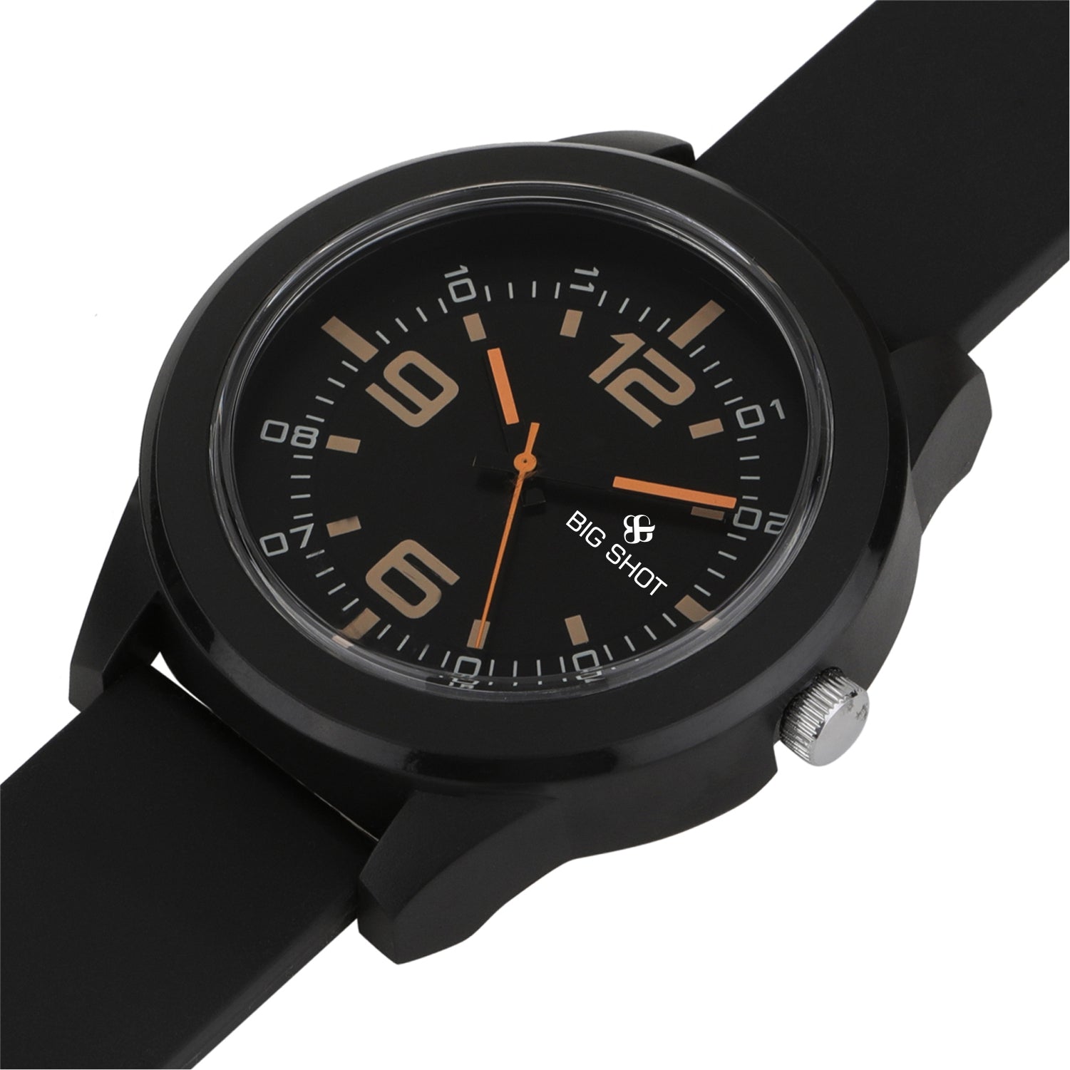 Add a refined edge to your style with the Big Shot men’s analog watch, featuring a striking black dial with golden numerals and markers. Its sleek black case paired with a comfortable silicone strap makes it both durable and versatile. Perfect for men who want a stylish watch that transitions effortlessly from casual to evening wear.
