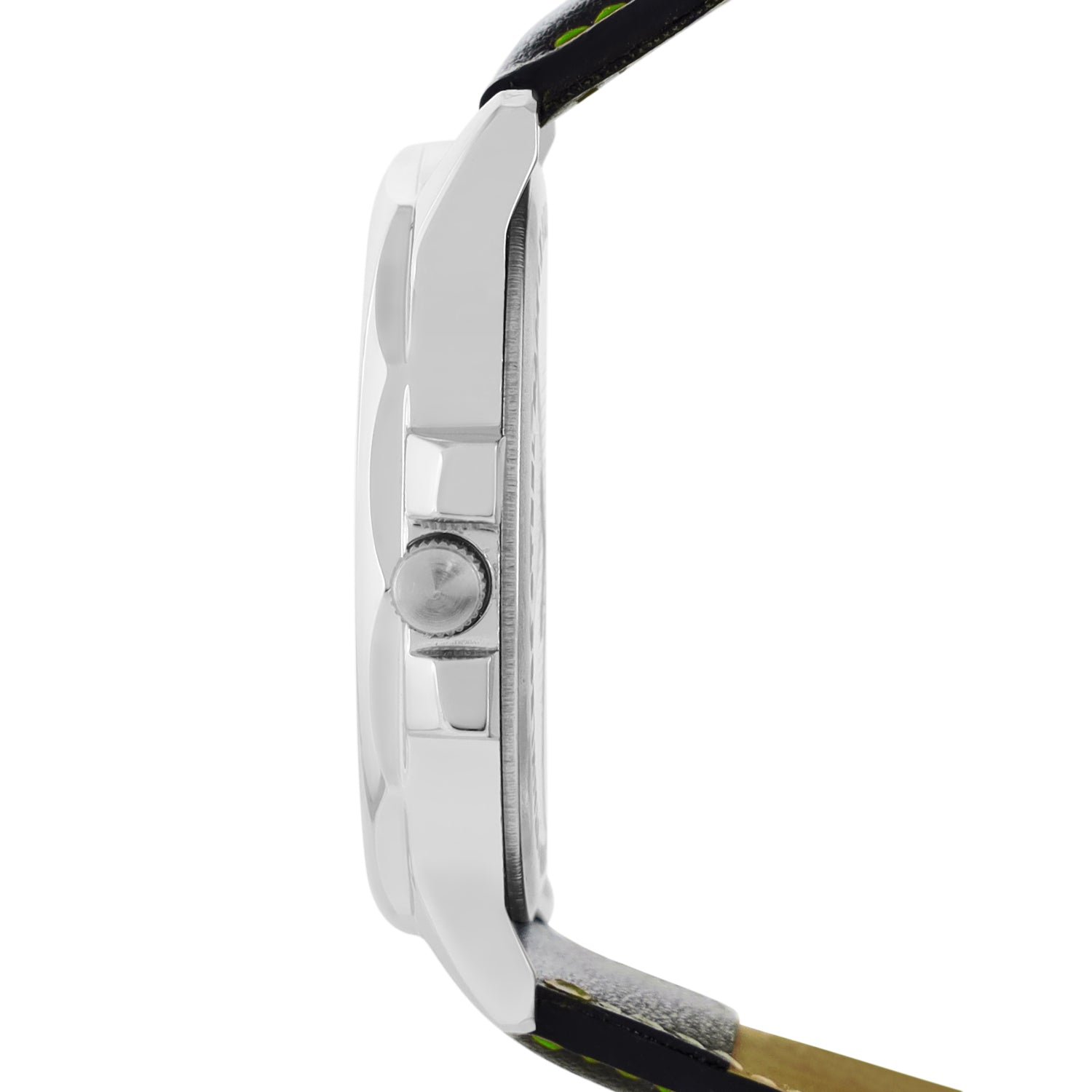 The Big Shot men’s watch brings a sporty edge to classic design. Its bold black textured dial with vibrant green accents makes a striking statement, while the polished silver-tone case adds a refined touch. Paired with a durable black leather strap featuring green contrast stitching, this timepiece is perfect for men who enjoy a mix of rugged style and everyday comfort.