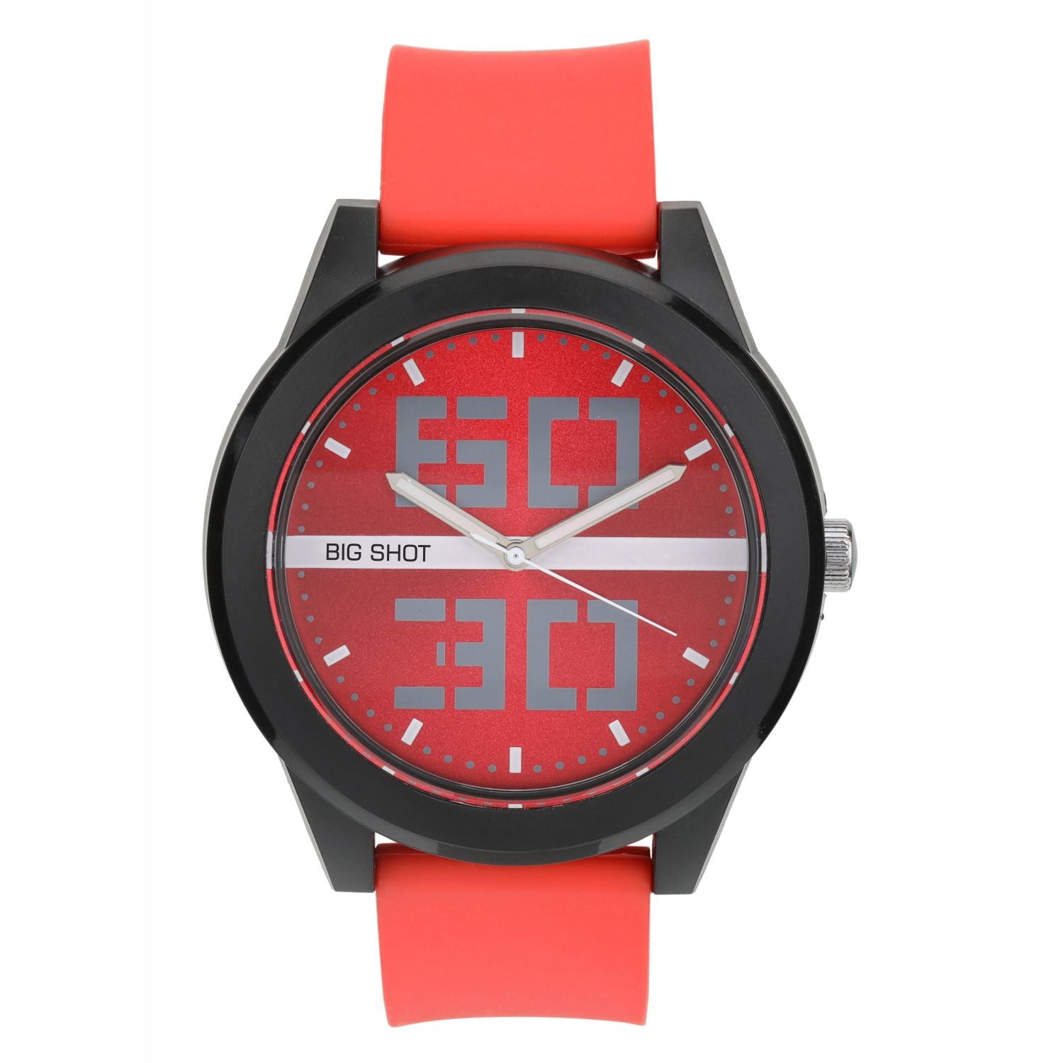 Elevate your casual look with the Big Shot men’s bold analog watch. Featuring a striking red dial with unique digital-inspired design, a sleek black case, and a bright red silicone strap, this watch is perfect for men who love sporty yet stylish accessories. Durable, lightweight, and eye-catching — a must-have for everyday wear.