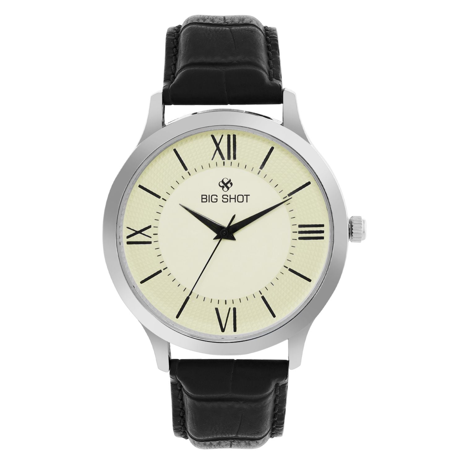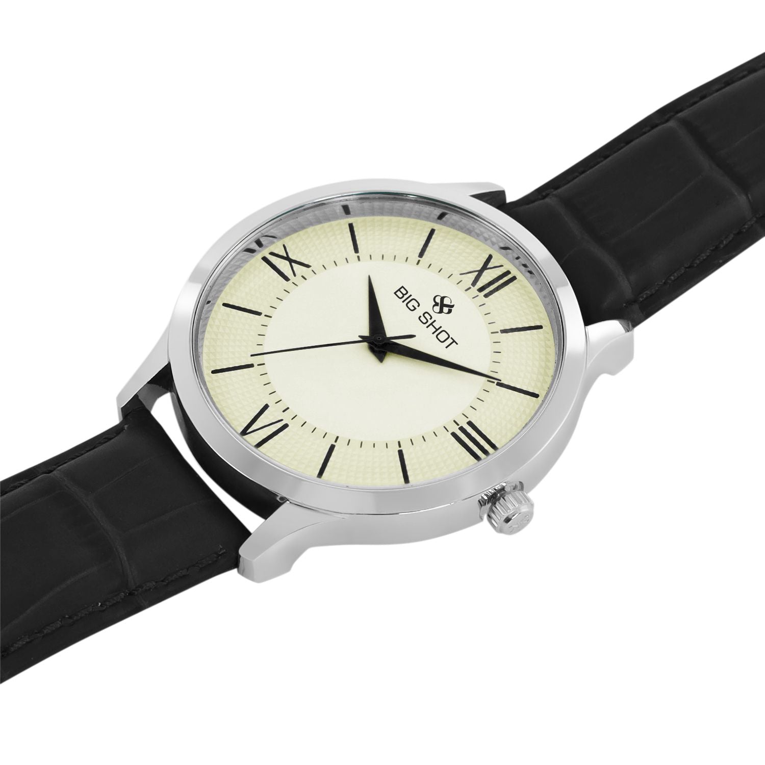 The Big Shot men’s watch combines timeless elegance with everyday utility. It features a refined cream dial adorned with bold Roman numerals, housed in a polished silver-tone case. The classic black leather strap ensures comfort and sophistication, making it an ideal accessory for formal occasions as well as daily wear.