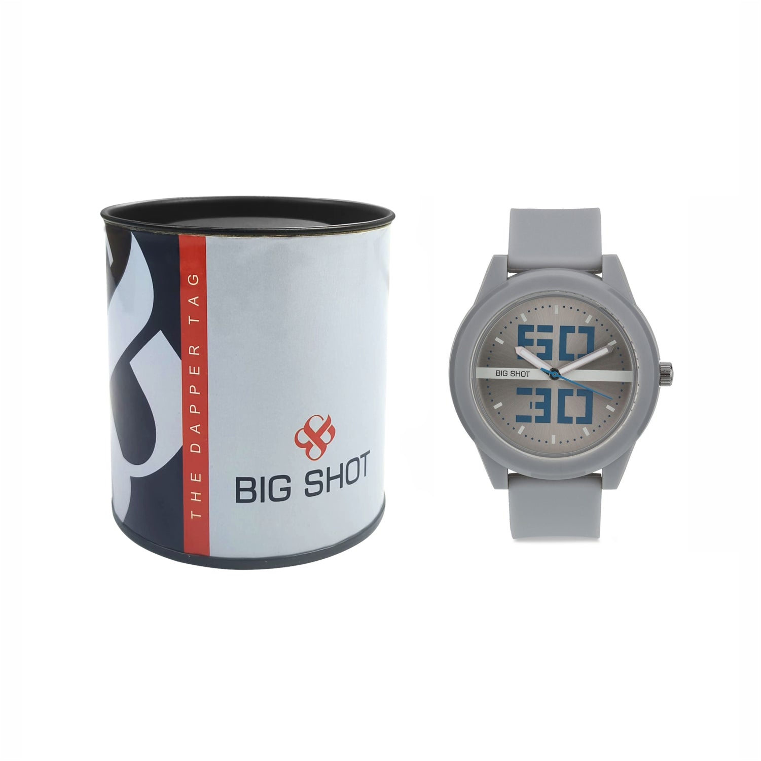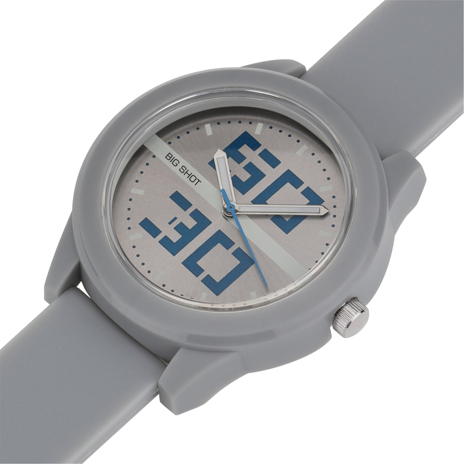 The Big Shot men’s watch showcases a trendy and youthful appeal. Designed with a bold grey dial featuring oversized blue digital-style numerals, it creates a unique modern look. The soft grey silicone strap ensures lasting comfort, making this watch a stylish pick for everyday casual wear.