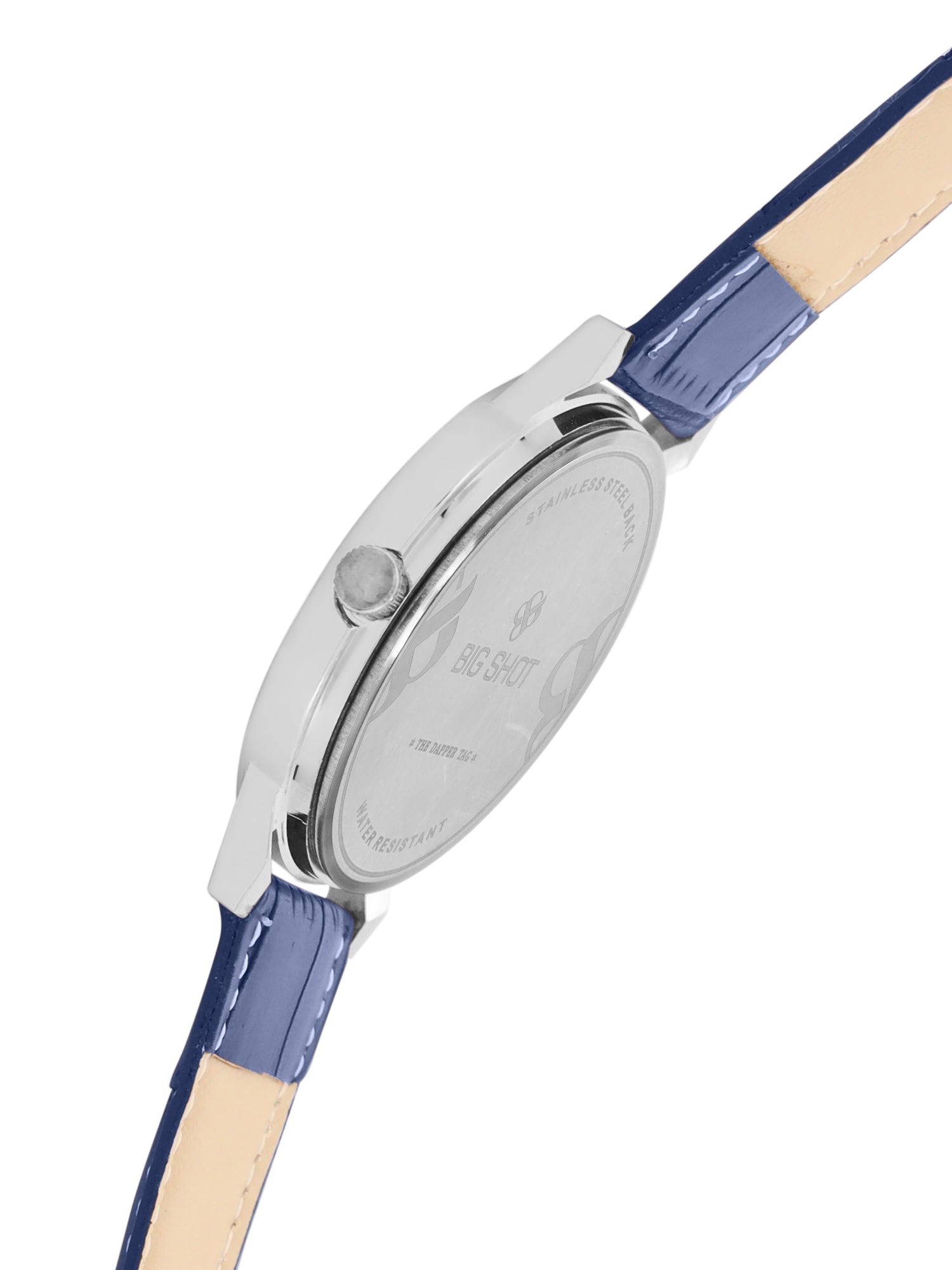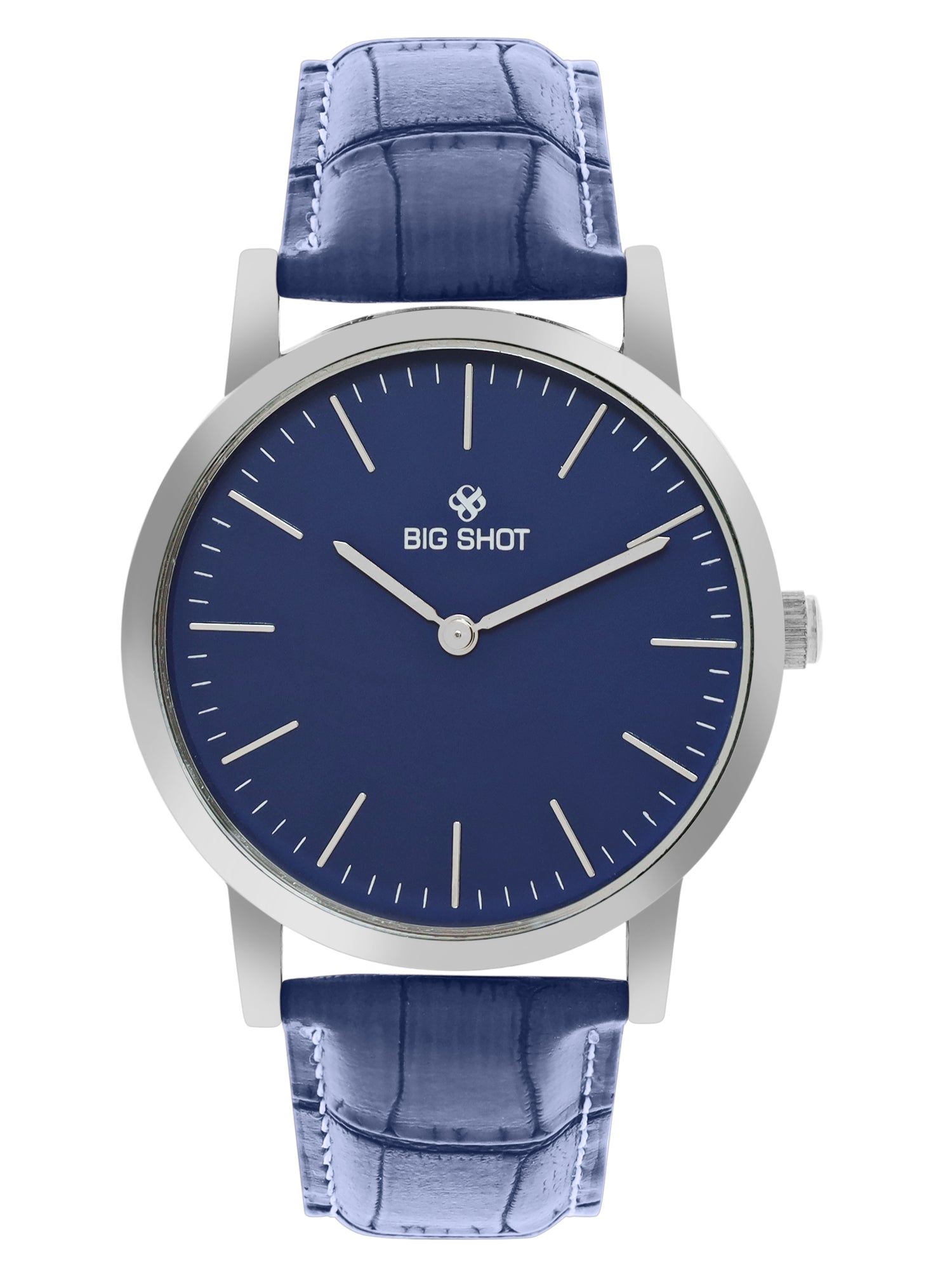 Elevate your style with the Big Shot minimalist men’s analog watch, featuring a sleek deep blue dial paired with a croc-textured blue leather strap. Its silver stainless steel case and refined design make it an ideal timepiece for both casual wear and formal occasions.