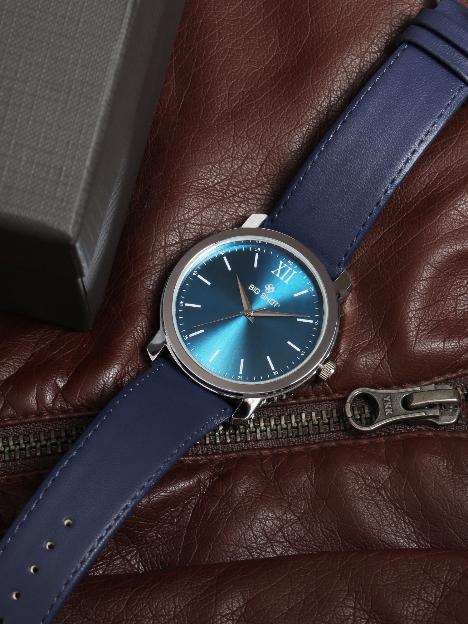 The Big Shot men’s watch combines minimalism with modern style. Featuring a striking blue sunray dial set in a sleek silver-tone case, it is complemented by a rich blue leather strap for a bold yet refined look. With its reliable quartz movement and timeless design, this watch is perfect for everyday wear as well as formal occasions.